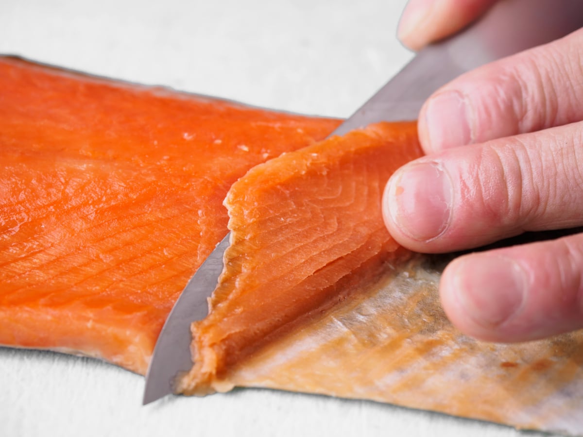 残ったサーモンフィレは乾燥させないために、残った皮で身を包み込むように折り込み、ラップ等に包んで冷蔵庫に保存して下さい。